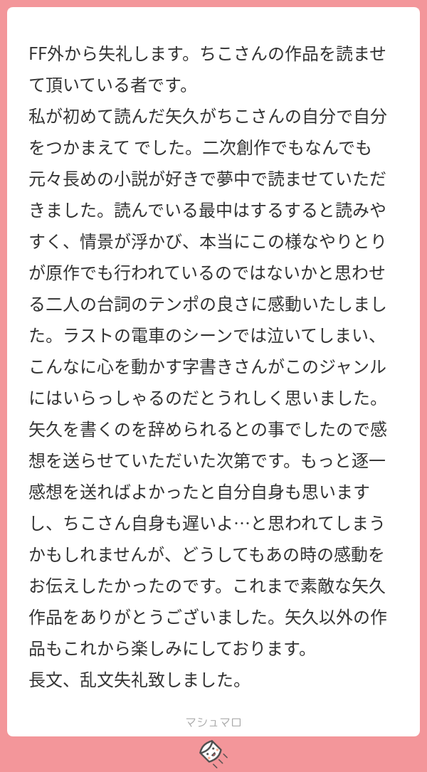 長めの作品は書いた人の何やらがいっぱい詰め込まれていて、長く楽しめるので読んでいて楽しいですよね。これもまた、私の何やらがたくさん詰め込まれています。電車で旅するのが好きだったので、矢久にもやってほしかった……。この二人のこういうの書きたい、読みたいを思ったままをいっぱい詰めたので楽しんで頂けてよかったです。あと、読みやすいという感想、とても嬉しいです^^