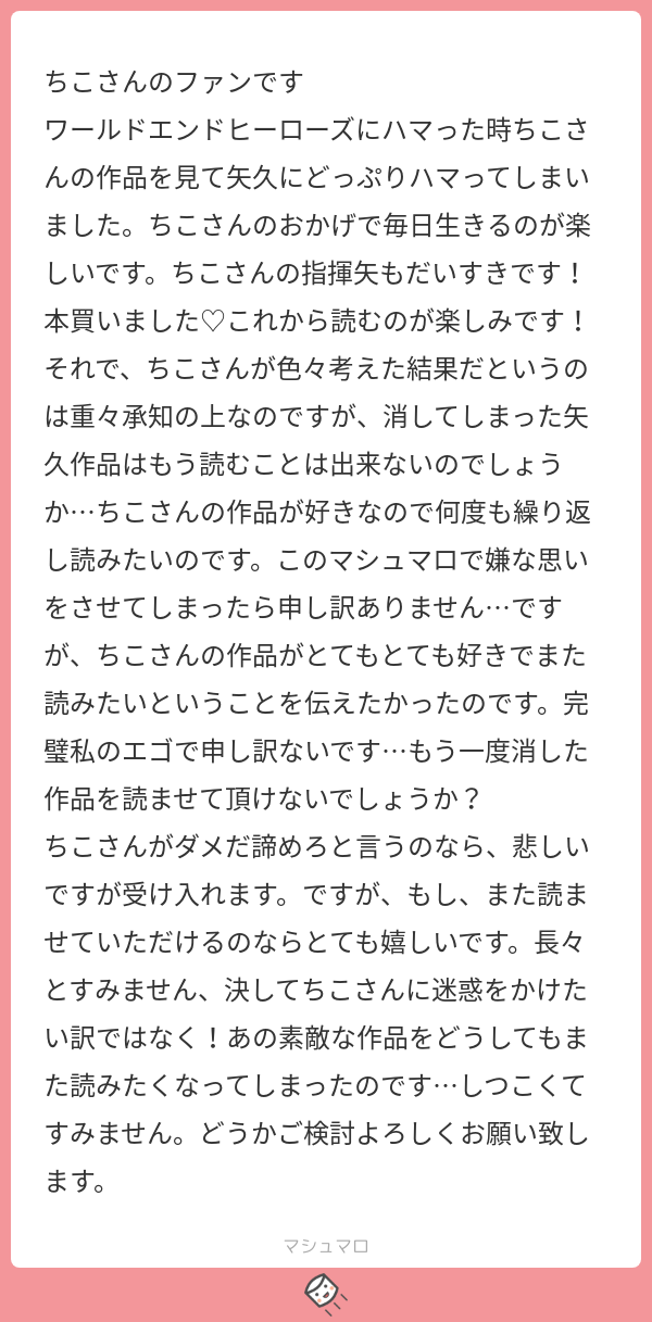 自作品をそこまで思って頂けるのは本当に嬉しいのですが、矢久地雷って言ってる女が矢久の作品を公開っていうのはどうなん……と思うので、再掲とかは考えていないですね。ご期待に添えなくてすみません。こちらこそ、完全に自分のエゴです。本当に申し訳ない。自分自分も本が完売したら、消そうかな……とか悩んでるくらいなので。まあ、売れてないので安泰なんですけどね~^^