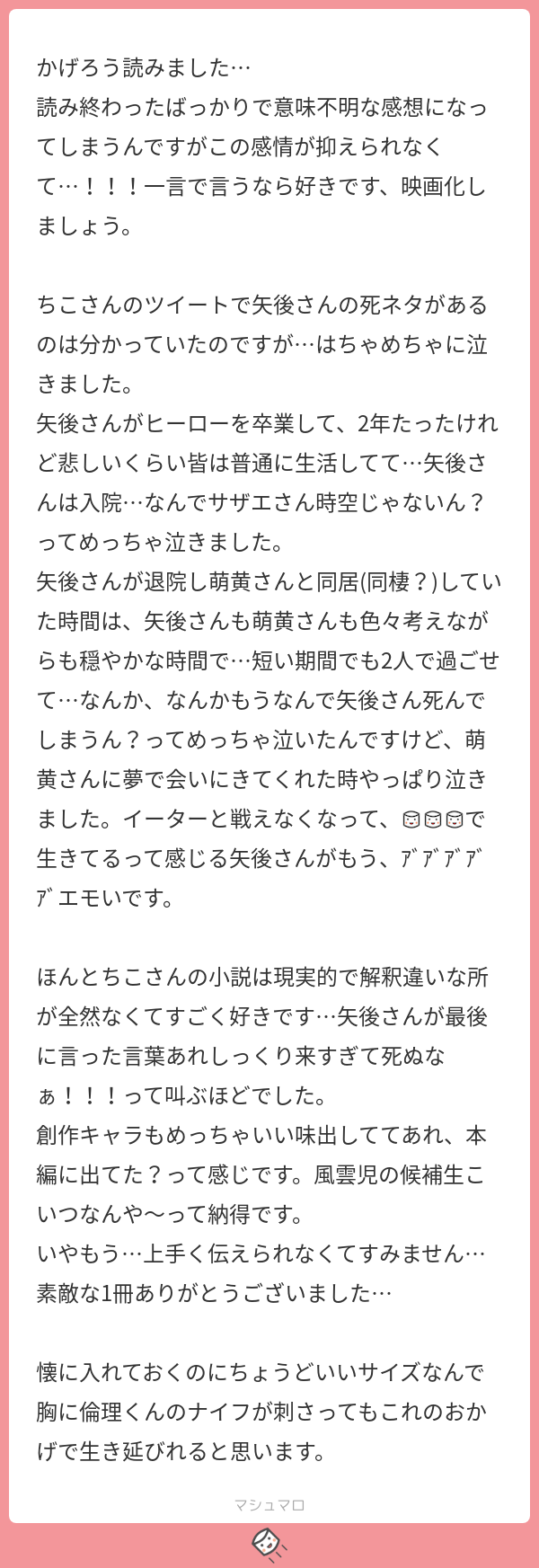 このお話では矢後の病気が割と現実的に進行して、最終的に死にましたが、個人的に今みたいにエッ、お前余命更新何十年目やねんってくらい生き延びてほしいとは思ってますね。奇跡的に治療方法見つかるでもいいよ……。